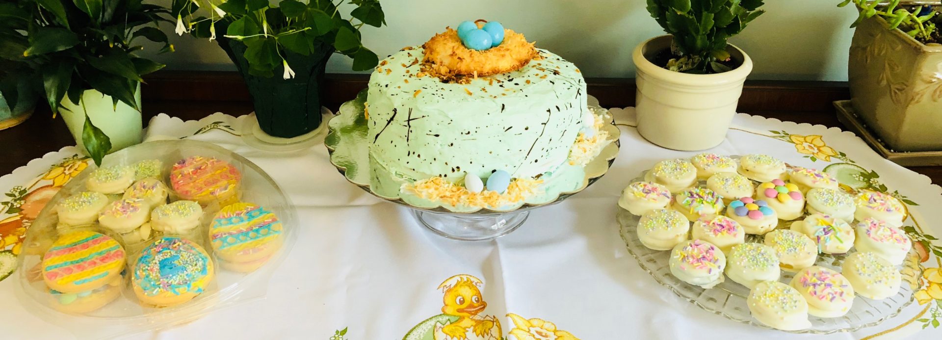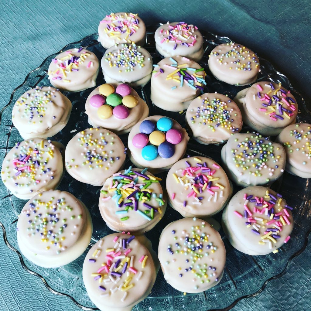 Is it silly to think that a robin egg malted coconut layer cake can communicate all that? Probably. But it didn’t stop me this weekend from speckling the entire kitchen with chocolate flecks to make that cake look just like a robin’s egg. Or from covering white chocolate-dipped Oreos in pretty springtime sprinkles so I could send treat bags home to my hubby’s parents and grandma.