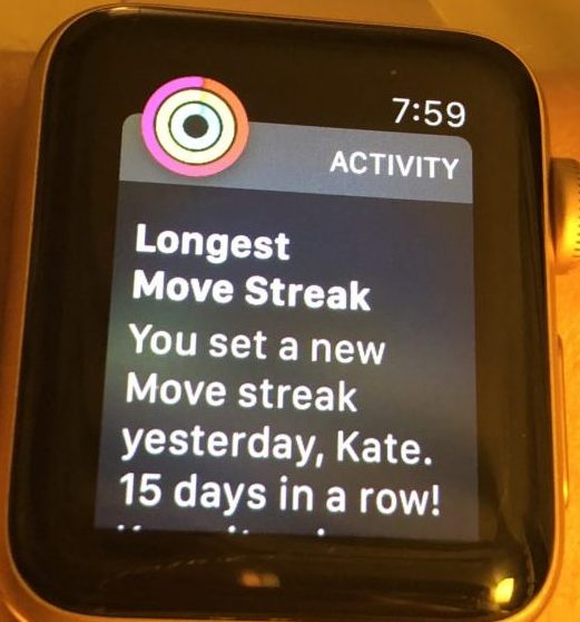 My Apple Watch has been buzzing each morning as soon as I put it on over the past few days. “You set a new Move streak yesterday, Kate. 15 days in a row! Keep it going today.”
