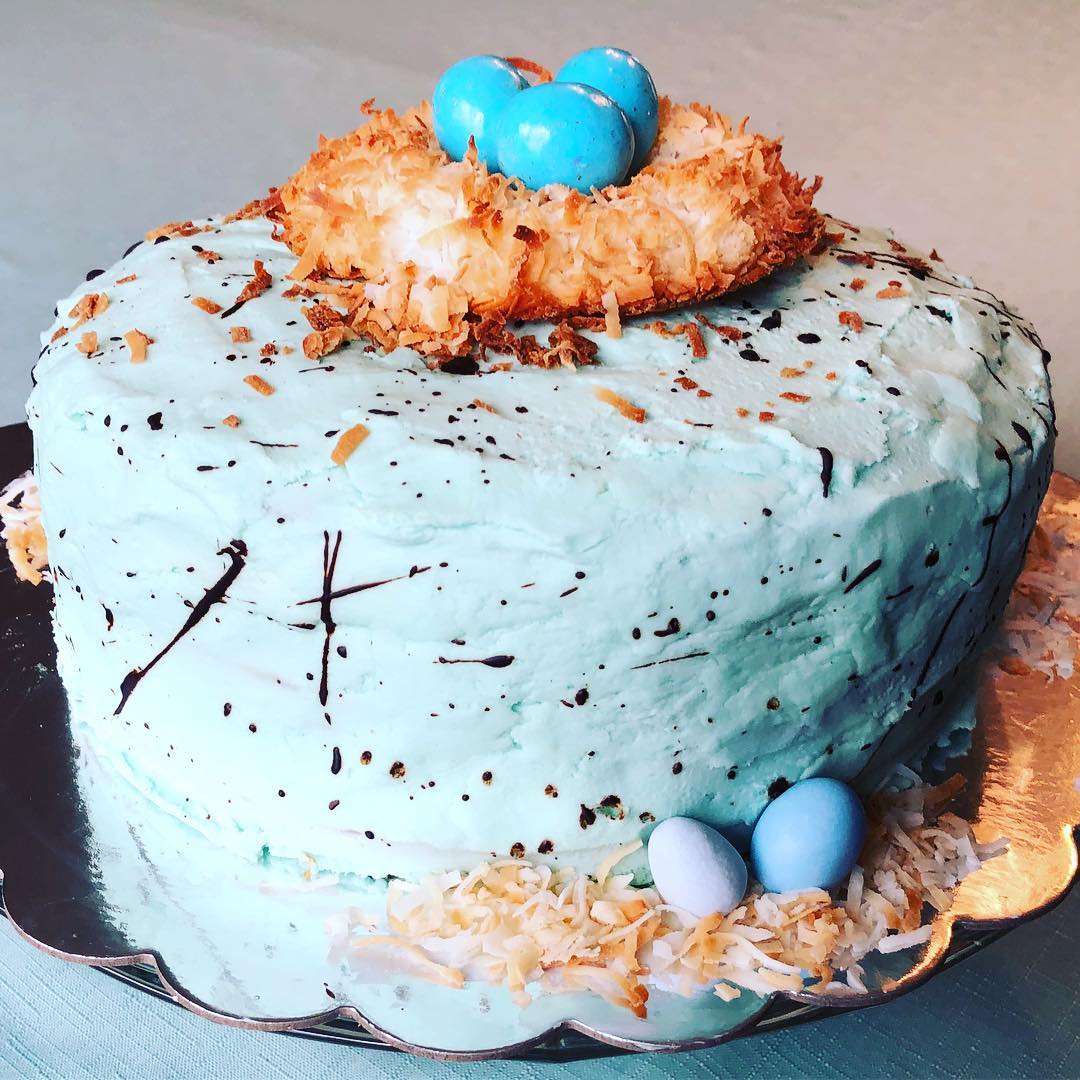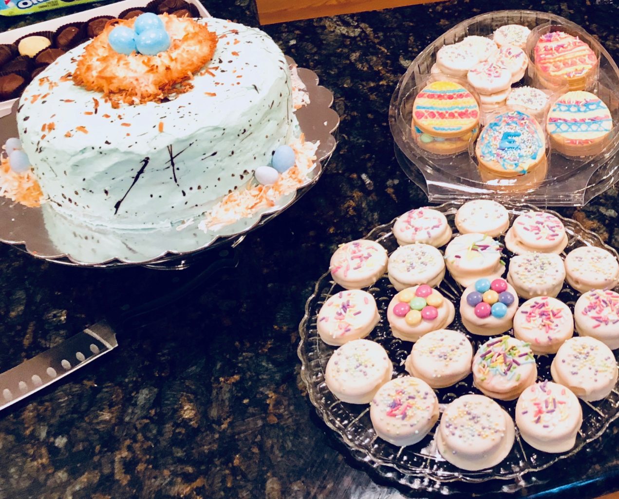 Is it silly to think that a robin egg malted coconut layer cake can communicate all that? Probably. But it didn’t stop me this weekend from speckling the entire kitchen with chocolate flecks to make that cake look just like a robin’s egg. Or from covering white chocolate-dipped Oreos in pretty springtime sprinkles so I could send treat bags home to my hubby’s parents and grandma.