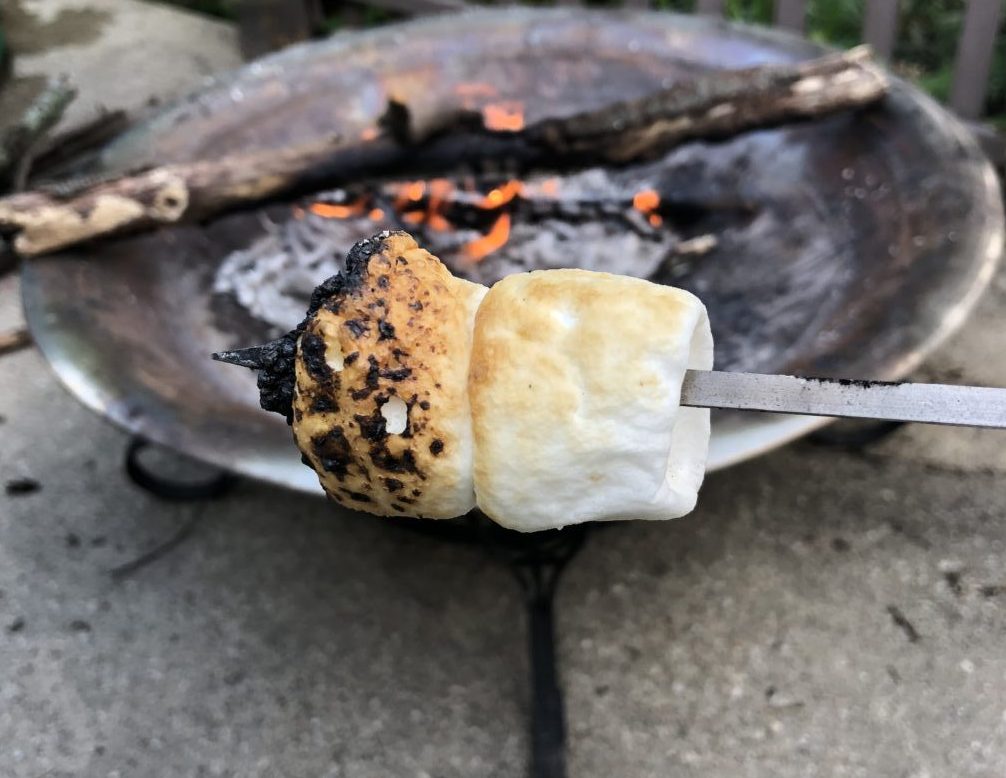 Backyard campfire fire pit roasted marshallows golden toasted on skewer