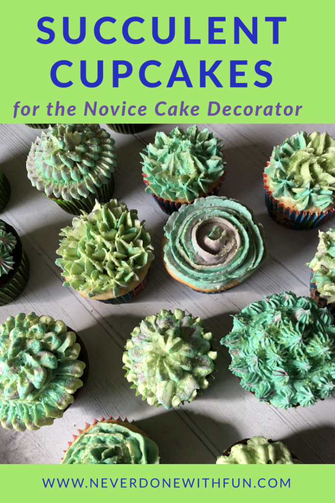 All of the succulents were created with just four Wilton cake decorator tips, all included with my favorite Wilton Dessert Decorator Pro Stainless Steel Cake Decorator Tool. I refer to this as my frosting gun because that’s basically what it is. It is easier and less messy than piping bags, and I like the control of the plunger to discharge the frosting just so. (Sorry, OCD perfectionist mom here.)
